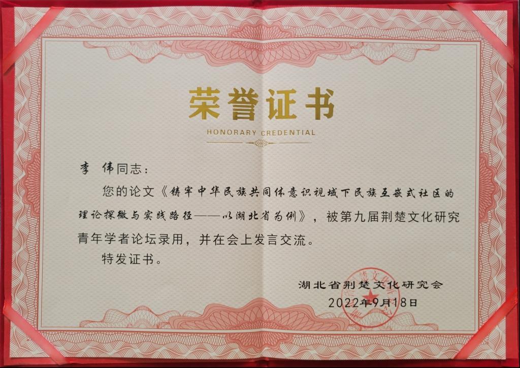 公司青年教师李伟博士提交的论文《铸牢中华民族共同体意识视域下民族互嵌式社区的理论探微与实践路径——以湖北省为例》被论坛录用,并在会上交流发言,文章围绕民族互嵌式社区的理论内涵、功能定位、运行机制以及湖北省构建民族互嵌式社区的实践模式、路径策略进行研究,对于加强湖北省民族工作高质量发展具有一定的理论价值与现实意义,受到专家的肯定与好评。
