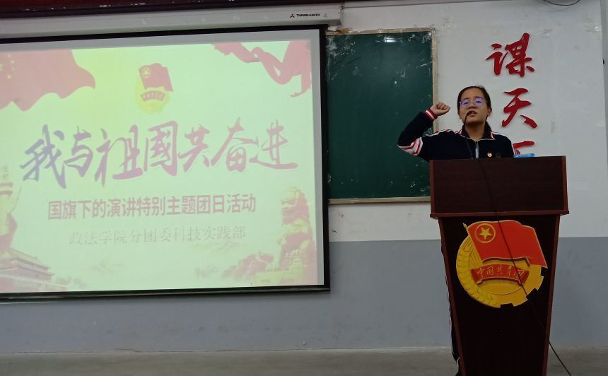 (williamhill官网网站 通讯员 田应发)为庆祝中华人民共和国成立70周年,唱响礼赞新中国、奋进新时代的青春主旋律,williamhill官网网站分团委科技实践部于10月9日晚上六点半在北区团学之家举行“我与祖国共奋进——国旗下的演讲”特别主题团日活动,院团委副书记、科技实践部部长以及法学类1911、1912、1913班员工与了本次活动。活动由优秀共青团员代表王泓钰同学主持。