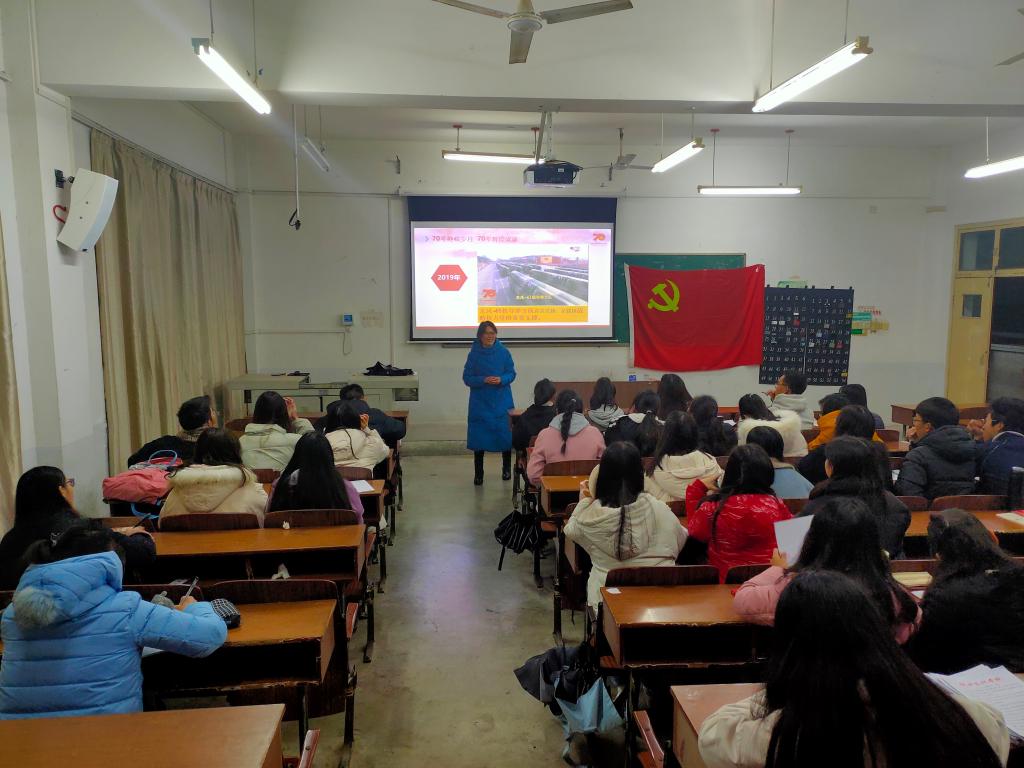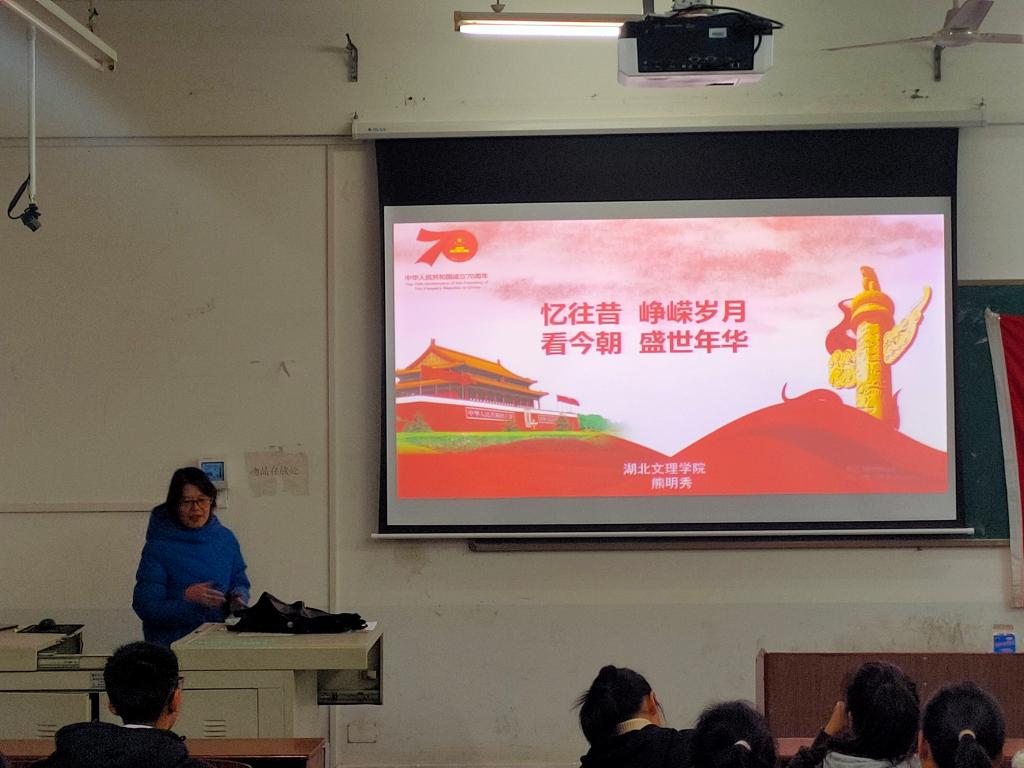 课程刚开始,熊明秀便向党校学员们开门见山的讲述了主题“忆峥嵘岁月”,展示七十年来的种种变化,七十年前的中国,如今的中国。熊明秀主要从新中国的经济建设,政治建设,文化建设和外交与国防建设入手,一一展示七十年的伟大成就。讲到经济建设时,熊明秀向学员们提供了一系列的数据:1952年到2018年,中国GDP从679.1亿跃升至90.03万亿元,实际增长174倍;人均GDP从119元提高到6.46万元,实际增长70倍。又以数字相差较大的文盲率突显出新中国成立以来的文化建设,成效惊人,并且依旧在继续建设专业的学科知识体系。“那只沉睡的雄狮醒来了,这是一头不惧困难,热爱和平的狮子”,熊明秀用这个恰当的比喻作为结束语告知学员们:现在的生活来之不易,更要不断努力,奋发向上,学员们也备受鼓舞。