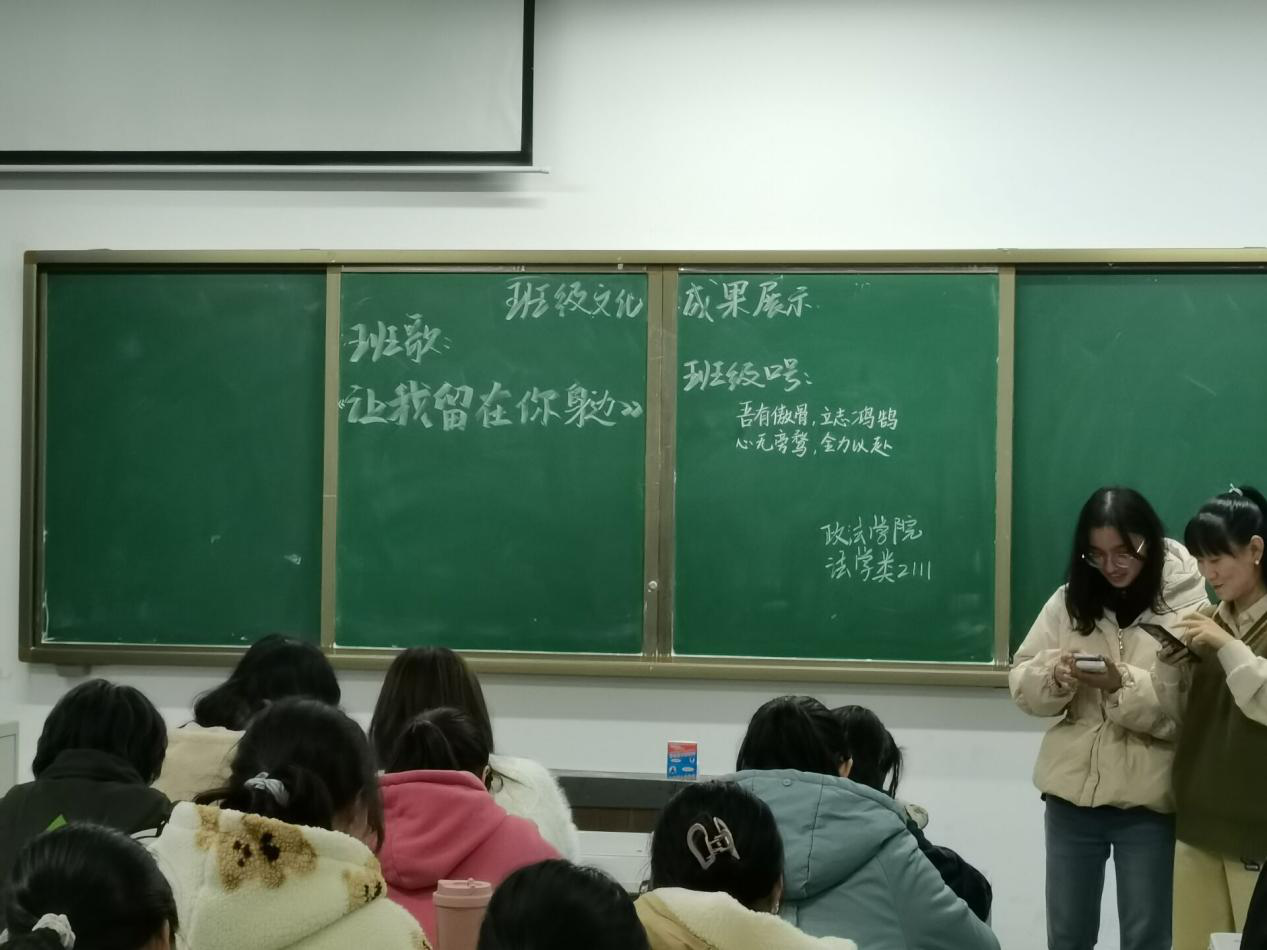 法学类2112班展示的是,班歌《我和我的祖国》,班级介绍:左手法典,右手国旗,心中的天平不倾斜,我们是211班我们为政法代言,班级口号“心之所向,道之所往。凝心聚力,逐梦前行”,班级精神“志存高远,脚踏实地,青春飞扬,永不言弃;扬我班威,壮我班魂,齐心合力,共创佳绩;骐骥一跃,不能十步,驽马十驾,功在不舍;博学睿思,勤勉致知,博学慎思,明辨笃行”。