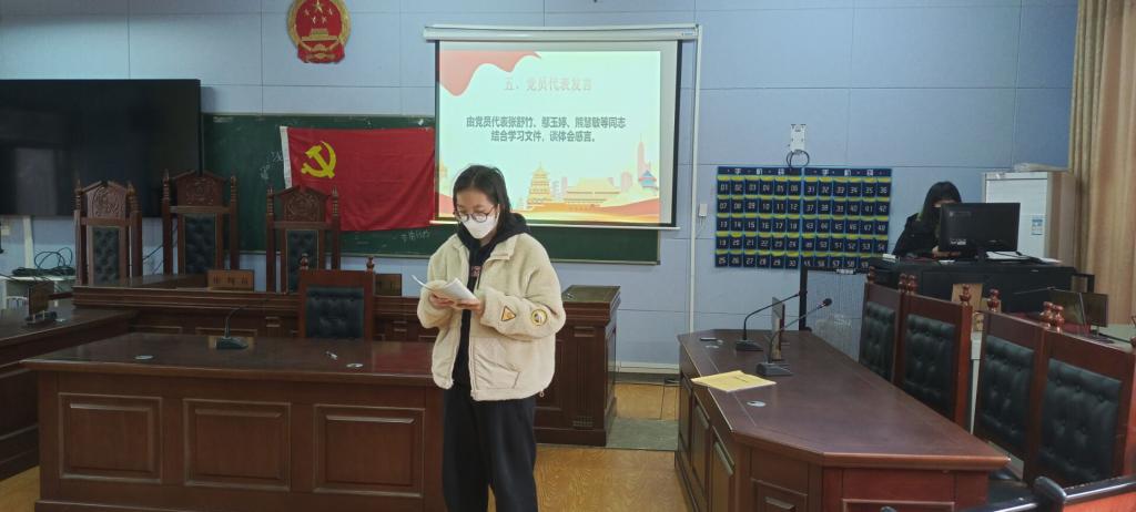 活动伊始,全体党员齐唱国歌,在汪美怡同志的带领下重温入党誓词,由蔡云伊同志领诵党章。接下来进行了学文件,谈体会活动。首先由蔡云伊同志领学了习近平总书记在党的十九届六中全会第二次全体会议上的重要讲话精神,深刻认识了总结党的百年奋斗重大成就和历史经验的重大意义、党的百年奋斗和初心使命、中国特色社会主义进入新时代的历史性成就和历史性变革等。随后姜敏娜同志领学了习近平总书记在中央政治局党史学习教育专题民主生活会上的重要讲话精神,提出要以习近平同志为核心的党中央保持一致,增强党的团结统一,增强历史自信,增强斗争精神,防范风险。最后由党员代表张舒竹、鄢玉婷、熊慧敏等同志结合学习文件,谈体会感言,她们表示青年党员必须有理想、有本领、有担当,不忘初心、立足本职、不断创新,新时代、新发展、新思路、新高度,在未来的学习工作中要脚踏实地,努力奋斗。