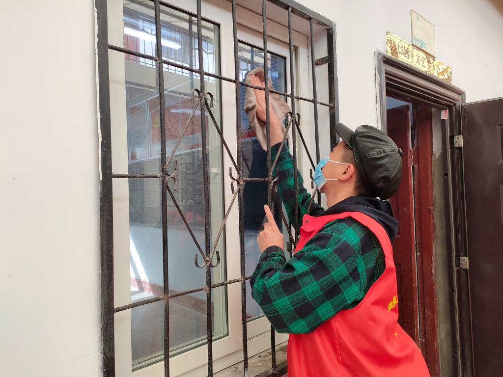 随后志愿者们在老师的安排下,分工合作,拖地、擦玻璃、擦桌子……在同学们的齐心合力下,老教师们活动的地方变得更加整洁了。
