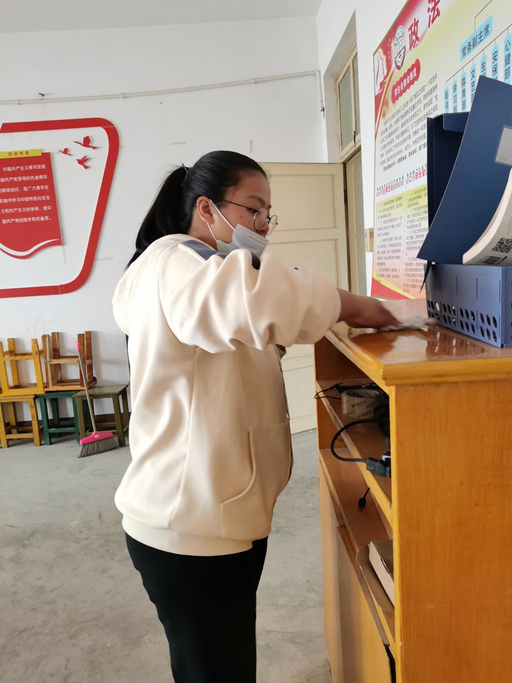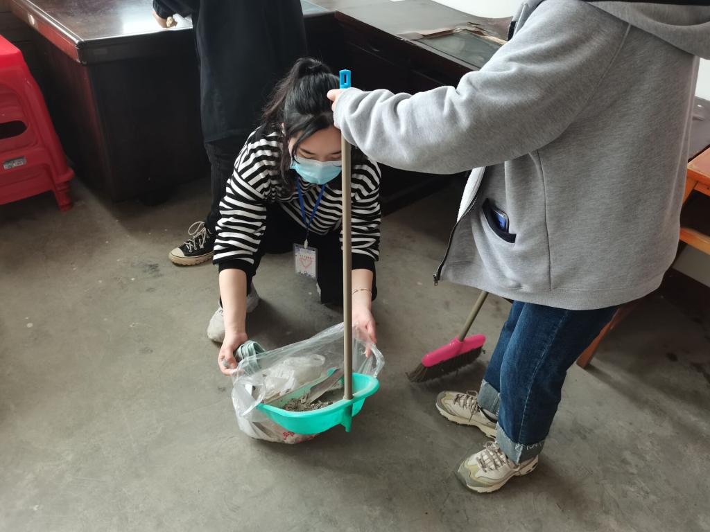 活动中,志愿者们分工明确,男同学搬动桌椅,女同学擦去灰尘,清理垃圾。经过两个小时的努力,所有东西分门别类的摆放整齐,活动室重新恢复了整洁,太阳透过窗户照射进来,屋内窗明几净。看着眼前的成果,心灵上的满足将身体上的疲惫一扫而空。