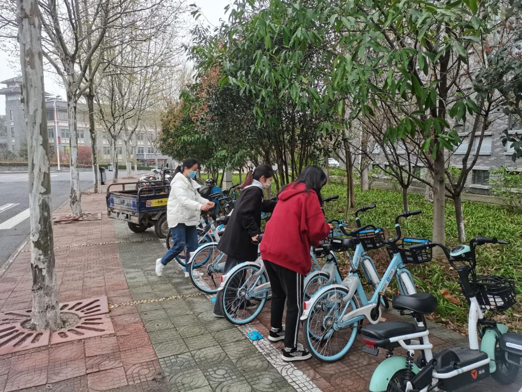 南区宿舍楼停放点,部分员工图方便将共享单车随意停放。活动中,志愿者分成两组,一组将停放杂乱的共享单车进行搬运,摆放整齐,另一组同学现场对停放共享单车的同学进行文明劝导,以达到同学们自觉将共享单车摆放整齐的目的。在所有同学共同的努力下,所有南区共享单车停放点的车辆整齐排列。