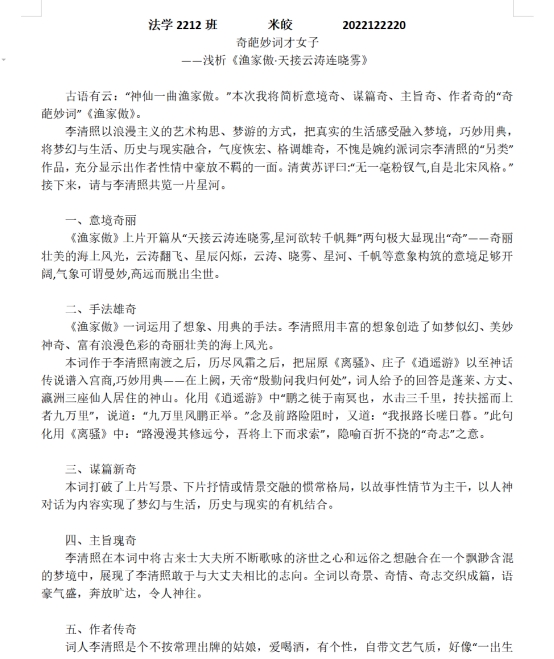 此活动为线上活动,作品需在4月23日前以规定形式提交给活动负责人。活动开展前期,活动负责人充分宣传,提前建立活动群聊并讲述相关活动事宜。活动内容分为三个部分,分别是经典诗文朗诵、诗词创作与诗歌鉴赏。在活动的开展过程中,同学们以多种形式积极参与活动,参赛同学均严格按照作品要求上交作品,在围绕作品主题的同时深扣作品内涵,挖掘其思想哲理。作品中完美展现出参赛者深厚的文学素养和阅读积累。活动结束后,所有作品由评委组共同商讨评定并颁布奖状。