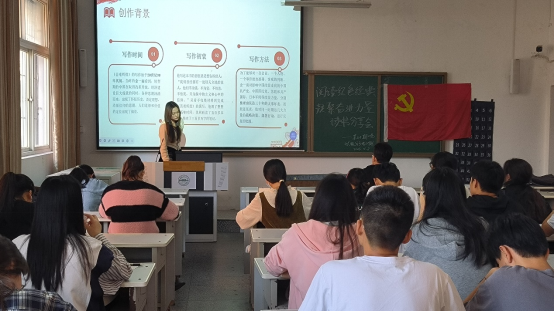 分享会上,首先由主持人邱福元同学宣布活动开始,并介绍本次活动背景,以及“阅读红色经典,凝聚奋进力量”的活动主题。接着由各组派两名代表同学依次上台发言分享红色经典的阅读体验,并结合自身的生活、学习,畅谈着自己的所思、所想、所感、所悟,分享着阅读的收获。《红星照耀中国》《红岩》《苦难辉煌》《为什么是中国》等平日里耳熟能详的红色经典书籍,在同学们精彩地讲述下更加散发出璀璨的红色光芒,深深感染着台下仔细聆听的同学们。其中,于荷同学分享的《苦难辉煌》,紧紧围绕着创作背景、作品介绍、读后感悟等方面展开了详细的介绍,讲述了书中蕴含的精神:立志救国的使命和担当,视死如归的英雄气概,献身人民的崇高精神,并建议同学们可以先从观看电视剧《十送红军》开始,有一个直观的感受后,再来阅读这本书。最后,于荷同学将读书的感悟体会归结为一句话:一个人只为自己活着,再潇洒,也是渺小的;一个人为民族为人类活着,再平凡,也是伟大的!