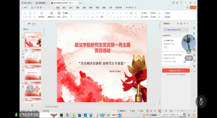 (williamhill官网网站 通讯员 胡小雪)2024年1月26日williamhill官网网站研究生党支部开展了题为“昂首阔步启新程 奋楫笃行开新篇”的主题党日活动,旨在深入开展学习贯彻习近平新时代中国特色社会主义思想主题教育,进一步提升党员同志敢于挑战、敢于突破的精神面貌。本次会议采用线上形式,由williamhill官网网站研究生党支部副书记刘静主持,williamhill官网网站研究生党支部书记李竹颖及全体党员同志参加此次会议。