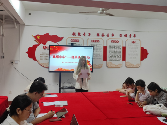 参赛选手选取我国古代、近现代和当代有社会影响力的,能体现中华优秀传统文化的经典诗文和作品进行了诵读。通过音调、语气、肢体语言等方式,参赛选手展示出了卓越的口才和表演技巧,传达出作品蕴含的情感与内涵。其中,李好选取了徐志摩的近代诗歌《再别康桥》,她用舒缓的语调道出了诗人的几分眷恋,几分惆怅;周婉滢朗读了当代诗人舒婷的《致橡树》,热情而坦诚地歌唱了自己的人格理想以及要求比肩而立、各自独立又深情相对的爱情观;胡昊蔚则选取了海子的抒情诗《面朝大海,春暖花开》,表达了对亲情友情的珍惜,同时真诚善良地祝愿同学们收获幸福。活动最后何子涵对参赛选手的表现进行点评,勉励同学们为传播中华民族优秀文化贡献自己的力量。