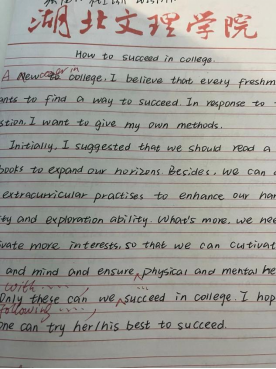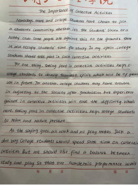 在由社工2311班主办的英语四级作文书法线下活动中,参赛者认真审题,积极思考,用心书写,展现出了出色的英语水平和书写能力。比赛的评分标准主要包括卷面整洁、书写工整和内容丰富等方面。评委们经过认真评审后,最终评选出了获胜者。通过比赛,成功提高了参赛者的英语水平和书写能力,营造了浓厚的英语学习氛围。参赛者不仅在英语写作和书法方面表现出色,还展现了积极向上的精神风貌和认真学习态度。
