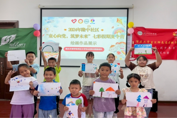 图为小朋友们展示自己画的美好世界