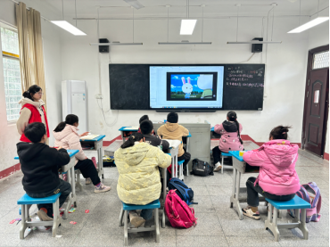 (图为志愿者李雅琴和四年级孩子们一起通过动画了解雷锋)