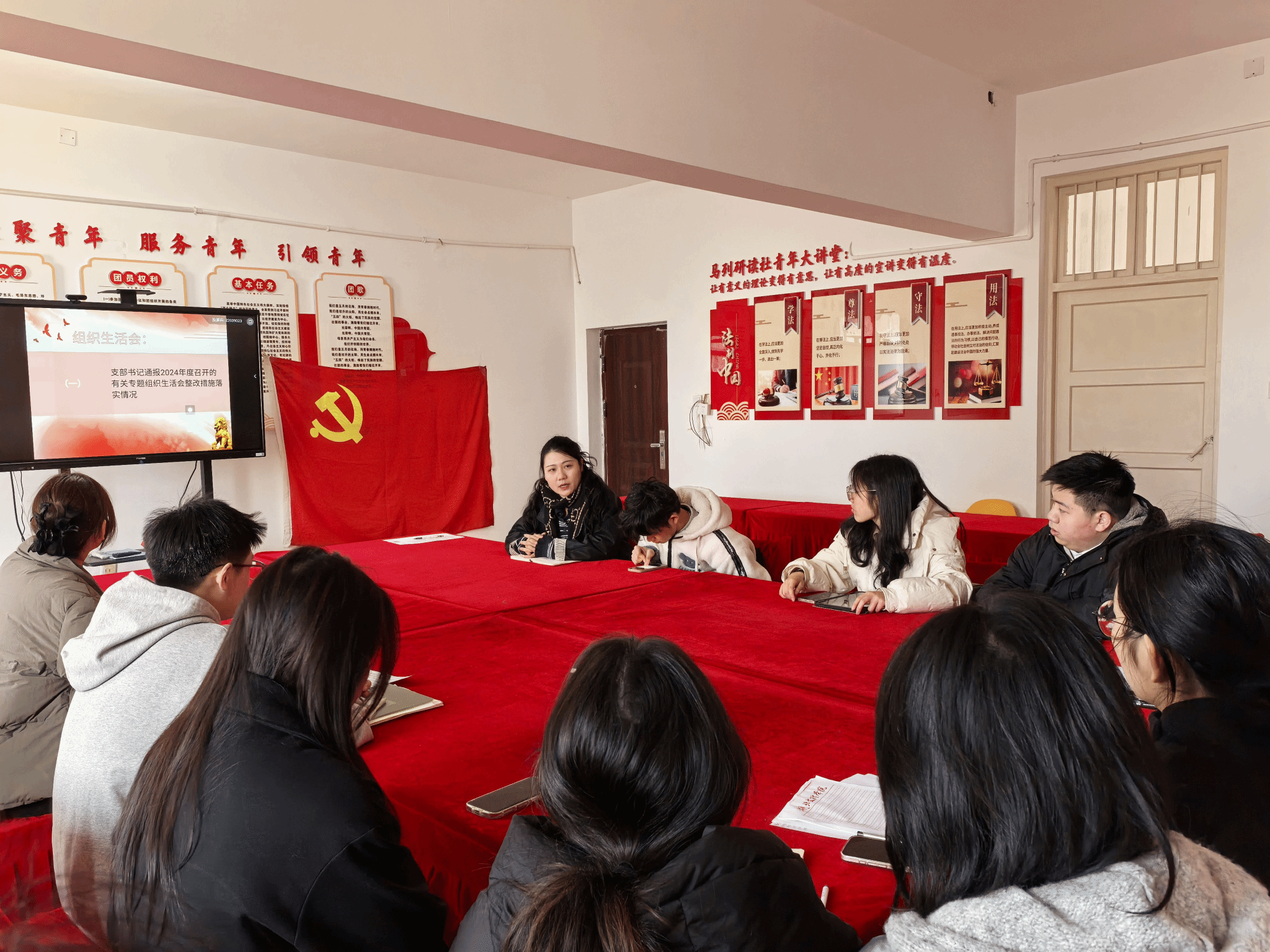 首先,全体党员齐唱国歌。随后,由胡熠暄同志领誓,全体党员重温入党誓词。理论学习环节,多位同志分别领学了《党章》《中国共产党纪律处分条例》《中国共产党廉洁自律准则》等重要党内法规。刘明慧同志带领大家学习《党章》第一章第三条,详细解读了党员享有的权利;汪雪睿同志领学《中国共产党廉洁自律准则》第一 、 第四条,强调党员要廉洁自律,坚守原则。邓晓涵、王海阳等同志也分别对相应条例和准则进行了深入讲解,引导党员们加强理论武装,严守纪律红线。在批评与自我批评环节,支部书记首先通报了2024年度有关专题组织生活会整改措施的落实情况,随后报告支委会对照检查材料。接着,支部党员依次进行个人对照检查,深刻剖析自身在思想、学习、工作等方面存在的问题。最后,支部书记代表支部委员会作表态发言,表示将认真梳理问题,制定切实可行的整改方案,确保整改工作取得实效。