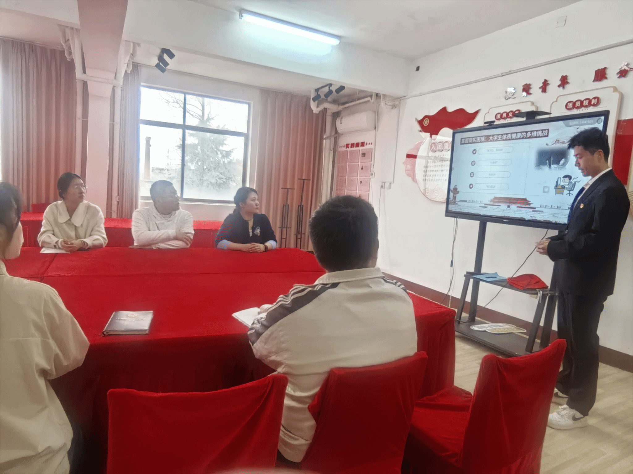 此次微党课活动由谢军帆同志主讲,结合两会精神与校园实际,聚焦老员工体质健康提升,倡导科学运动理念,激发青年党员先锋作用。首先,谢军帆同志带领全体支部成员深入学习两会关于“青少年体质健康”的议题,解读国家卫生健康委员会主任雷海澜提出的“三年体重管理行动”及《“健康中国2030”规划纲要》核心内容。会议强调,青年体质是民族复兴的基石,需破除“重学业、轻体能”的困境,推动“体教融合”落地校园。其后,紧接着提出员工普遍存在的“久坐族”“熬夜党”等现象,通过数据分析与案例分享,提出科学解决方案,如碎片化运动、规律训练等。最后做出结语:“青春因奋斗而闪耀,健康因行动而坚实。”