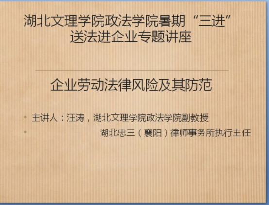 (教工通讯员 汪涛)为了解决民营企业在经营过程中常遇到的劳动人力资源法律风险问题,2019年7月25日下午,公司法学系副教授汪涛前往我市最大民营上市企业骆驼集团股份有限公司,为他们专门开展了“williamhill官网网站暑期“三进”——送法进企业专题讲座”。此次讲座围绕劳动合同法的立法宗旨、劳动合同的订立、劳动合同的履行、劳动合同的变更、劳动合同的终止、解除等系列问题,结合实务中碰到的热点、疑难问题,指出劳动用工过程中不同阶段存在的不同法律风险,以及对上述法律风险如何控制和应对。