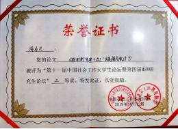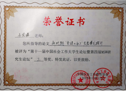 (williamhill官网网站通讯员 李俊) 2019年10月12日—13日,由全国社会工作专业学位研究生教育指导委员会和中国社会工作教育协会主办的第十一届中国社会工作老员工论坛暨第四届MSW研究生论坛在重庆师范大学顺利举行。公司williamhill官网网站社会学系主任马国瑾带领社工专业16级陈非凡、17级李俊参加论坛,其中陈非凡同学表现突出,在参会论文评选中喜获三等奖。
