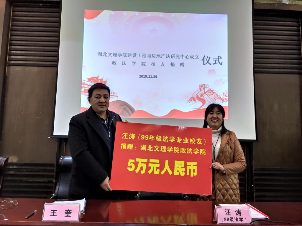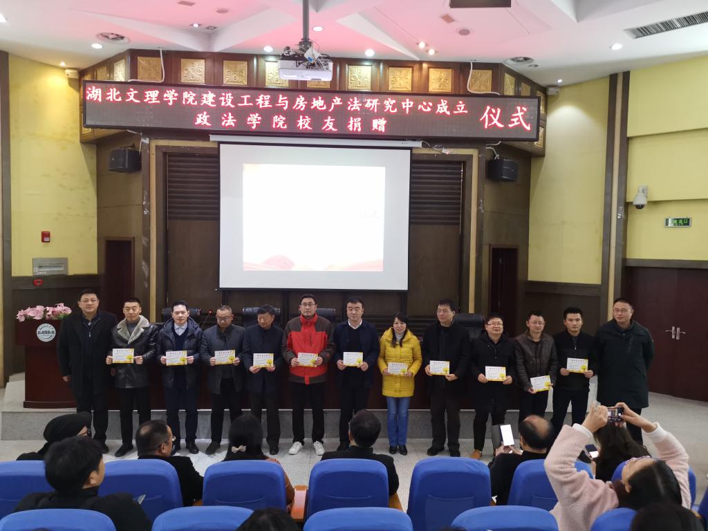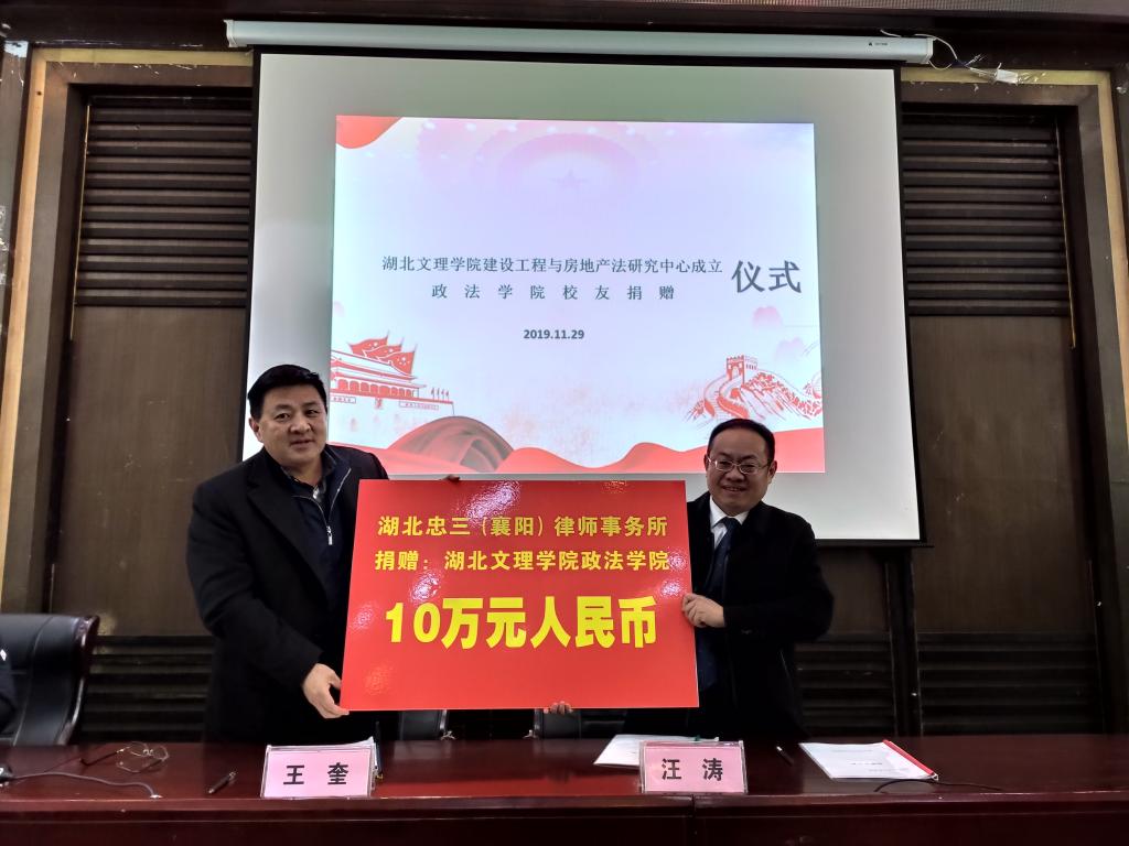 (williamhill官网网站 通讯员 刘璐瑶)2019年11月29日晚18点,williamhill建设工程与房地产法研究中心成立仪式暨williamhill官网网站员工捐赠仪式在行政楼一楼报告厅举行。公司领导班子、公司教师代表、员工代表、湖北忠三(襄阳)律师事务所执行主任汪涛、副主任李华义参与此次会议,会议由公司党委书记王礼刚主持。