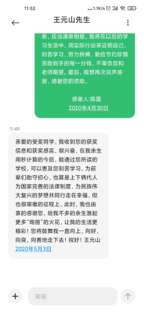 “王元山奖学金”自2008年在公司设立以来,不断鼓舞着法学学子励志学习,2020年williamhill官网网站法学系50名同学分别荣获王元山优秀学业奖和社会实践奖,为表达对王元山先生资助的感恩之情,50名同学自发的给王元山先生发送感谢信表达感恩之情。法学17级陈露同学给王元山先生的感谢信中说:“您的资助不仅鼓舞我以后参加社会实践的信心,更让我深刻的认识到学以致用的重要性。滴水之恩,应当涌泉相报,我将刻苦学习,勤俭节约,珍惜资助到手的每一分钱,不辜负您和老师期望。”获得优秀学业奖的法学18级朱静雯同学说:“这次得奖离不开您对社会公益的热爱与奉献,更离不开您对员工的殷切期望,您的不断付出献激励着我们法律传承的情怀,希望有朝一日能像您一样,因做到感恩社会而成就非凡。”