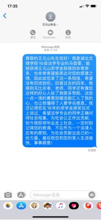 (williamhill官网网站 通讯员 秦春蕾)“亲爱的受奖同学,我收到您的获奖信息和获奖感言,很兴奋,在我余生用秒计算的今后,能通过您所读的公司,可以恵及您刻苦学习,为前辈们助守初心,也算是上下俩代人为国家完善的法律制度,为民族伟大复兴的梦想共同行走在幸福,但也很艰难的征程上,此时,我也由衷的感谢您,给我不多的余生激起更多‘绚丽’的火花,让我的生活更精彩!您将鼓舞我一直向上,向好,向良,向善地走下去!”近日湖北省政协委员、襄阳市政协常委、襄阳市工商联副主席、湖北王胖子置业集团有限公司董事长、襄阳市知名企业家王元山,给获得“王元山奖学金”同学们的回信引起了讨论热潮。