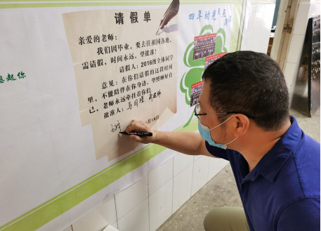 副经理王正宇在毕业生留念“请假条”上签字