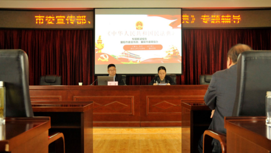 2020年9月24日下午,公司法学系何普博士应襄阳市委宣传部、襄阳市委网信办的邀请,为襄阳市委宣传部、襄阳市委网信办的干部讲授《中华人民共和国民法典》的相关内容。市委宣传部机关党委专职副书记刘蓉娇主持讲座,市委宣传部常务副部长曹荣葆参加讲座。