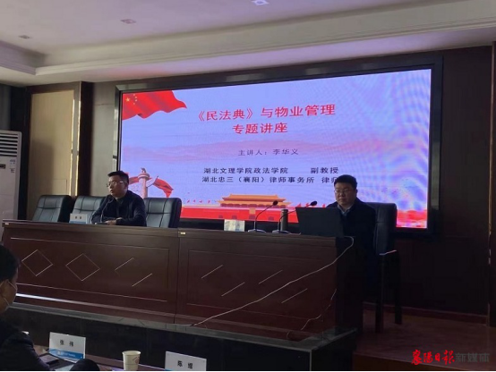 为进一步提高社区工作人员及物业服务企业对《中华人民共和国民法典》的认识,指导社区工作人员及物业服务企业更好地依法依规开展物业服务工作。2020年12月23日,襄阳高新区七里河街道办事处特邀请williamhill官网网站副教授、建设工程与房地产法研究中心主任李华义对《中华人民共和国民法典》中与物业管理相关条款进行解读。街道办事处的干部及其辖区的社区工作人员以及物业服务企业的负责人60余人参加了会议。