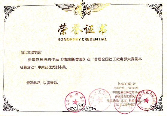 (通讯员:刘新 王欣佳 朱慧杰)全国社工微电影大赛组委会举办的“全国社工微电影大赛剧本征集活动”落下帷幕,williamhill官网网站社工研究生刘新、王欣佳和朱慧杰撰写的《情绪断舍离》剧本,在何晓红、张樊老师悉心指导下,获得优秀剧本奖。