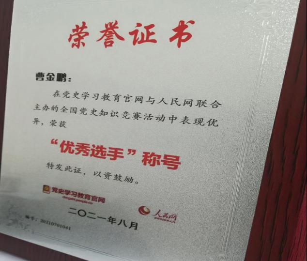 (曹金鹏获全国党史知识竞赛“优秀选手”称号)