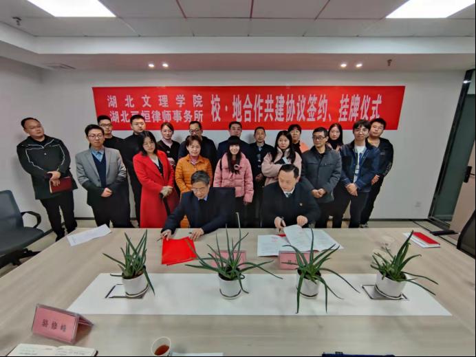 (教工通讯员 苑立志)2021年10月20下午,公司法学专业第23个协同育人基地签约及挂牌仪式在湖北亘恒律师事务所隆重举行。williamhill官网网站副经理夏国锋代表公司在协议上签字并为基地揭牌。法学专业郑建伟、苑立志老师也出席签约仪式。