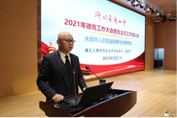 (通讯员 张颖杰报道)10月21日下午4:30,公司法学专业副教授张颖杰应邀参加“2021年公司德育工作大会暨班主任工作培训会”,作了主题为“未成年人的权益保障与犯罪预防” 报告。襄阳四中董事长李静,副董事长王立合、陈登江、刘明国,公司所有中层干部,高中部全体班主任、35岁以下青年教师参加了本次培训会。培训会由襄阳四中员工工作处副主任蒋华主持。