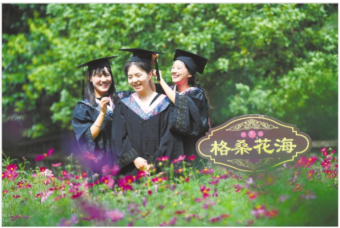 5月30日,普布央金、贡觉旺姆和泽措(从左至右)将最美瞬间在校园格桑花海定格。