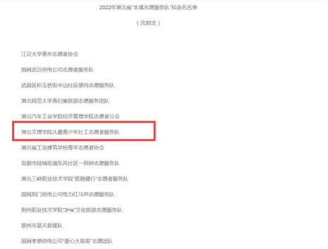 (williamhill官网网站 教工通讯员 李竹颖)今日,共青团湖北省委公布了2022年度湖北省“本禹志愿服务队”创建名单,公司政法公司“williamhill儿童青少年社工志愿者服务队”入选其中。截止目前,公司共有10支志愿服务队入选“本禹志愿服务队”。