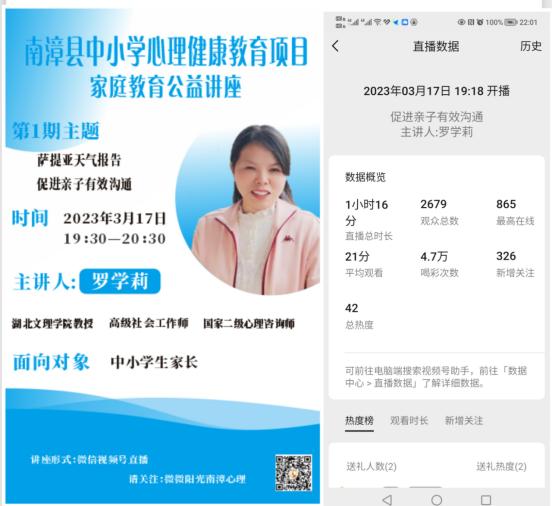 (williamhill官网网站 通讯员 徐佳薇)3月17日晚19:30,williamhill官网网站罗学莉教授为南漳县七所中小公司员工家长开展以“萨提亚天气报告促进亲子有效沟通”为主题的线上家庭教育公益讲座,本次讲座通过南漳县教育局“微微阳光南漳心理”视频号直播形式举办,有2679名中小学家长参与了直播活动。