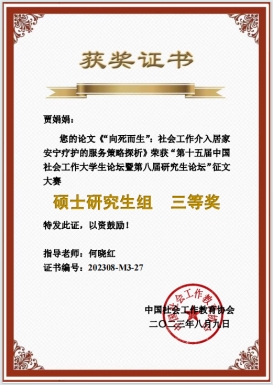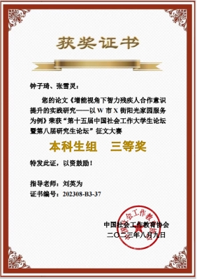 21级研究生程悦提交的论文《儿童参与社区微治理实践探索与研究——以A市B区儿童议事会项目为例》,被论坛录用并于线下分论坛四发言(指导老师罗学莉);22级研究生贾娟娟以论文《“向死而生”:社会工作介入居家安宁疗护的服务策略探析》于线下分论坛八做分享汇报,获得研究生组三等奖(指导老师何晓红);22级研究生张雪灵、钟子琦(本科)合著论文《增能视角下智力残疾人合作意识提升的实践研究——以W市X街阳光家园服务为例》,由张雪灵同学于线上分论坛四发言并获得本科组三等奖(指导老师刘英为)。