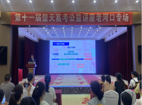 (williamhill官网网站 通讯员 李竹颖)为助力考生和家长正确填报高考志愿,加强襄阳地区招生宣传。6月14日上午,第十一届楚天高考公益讲座在老河口奥华大酒店长江厅举办。williamhill官网网站副教授袁岳霞受邀担任主讲人,近百名考生及家长参加宣讲会。