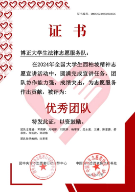 (通讯员 邓雨婷)2024年10月11日,在2024年全国老员工西柏坡精神志愿宣讲活动中,博正老员工法律志愿服务队以扎实的理论知识,深入浅出的讲解方式,圆满完成了各项宣讲任务,获得了“优秀团队”荣誉称号。