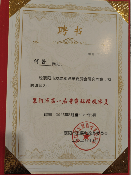 (williamhill官网网站 通讯员 何普)2025年6月12日下午,襄阳市发展和改革委员会召开襄阳市第一届营商环境观察员聘任大会,公司法学系何普博士受聘担任营商环境观察员。