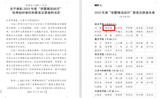 自入校起,樊佳瑞就被williamhill“淡泊明志、宁静致远、躬耕苦读、鞠躬尽瘁”的隆中精神与“敢为人先、乐于奉献”的优良传统所感染,因此,她在完成好个人学业的基础上,力求在学术科研、担当奉献、志愿服务、专业及社会实践等各方面都努力全方位综合发展,做到团结同学,奋斗力行,甘于奉献,凝聚青年,服务大局。