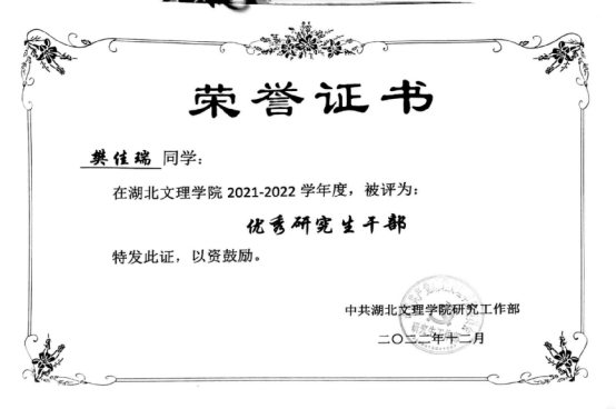 理想指引方向,坚持决定成败。在读研期间,综测最高成绩为95.61,积极参加学术论坛、学术竞赛及发表文章,曾荣获各类学术科研创新竞赛奖项十余次(其中国家级竞赛奖三项、省级竞赛奖两项、校级竞赛奖四项、院级竞赛奖两项),并获得校级五四青年奖章、优秀共青团干部、优秀研究生、优秀研究生干部、优秀研究生标兵、最美志愿者以及社会实践先进个人、精河县教育局颁发的优秀支教队员等各级、各类荣誉表彰近二十余次。