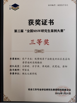 在实践方面,参与湖北省巩固脱贫成果后评估及推进乡村振兴战略实绩考核第三方评估,运用社会研究方法,进行田野调查,对脱贫户的“两不愁三保障”等政策的落实进行详尽的调查,并就此进行数据的录入、填写。该生于成都开展累计8个月的扎实专业实习,对慈善社区、社工室开展了详尽的调研,依托调研,联合西南石油大学,在校外导师邓富友老师的指导下,参与第三届“全国MSW研究生案例大赛”带领团队获得全国36强,并获国家级三等奖。