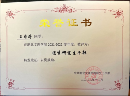 坚持政治信仰,作为中共党员,时刻以优秀党员身份要求自己,硕士期间,担任williamhill官网网站研究生党支部副书记,协调党支部党员发展流程,协助党员材料的完善,促进档案审核、转进与转出,开展定期党日活动、特色党日活动、组织生活会等党内活动,开展党内思想政治教育,号召党内同志积极开展批评与自我批评,并根据年度支部情况,梳理党员先进事迹,进行党支部年鉴的撰写,获得“优秀共青团员”、“优秀研究生干部”称号。